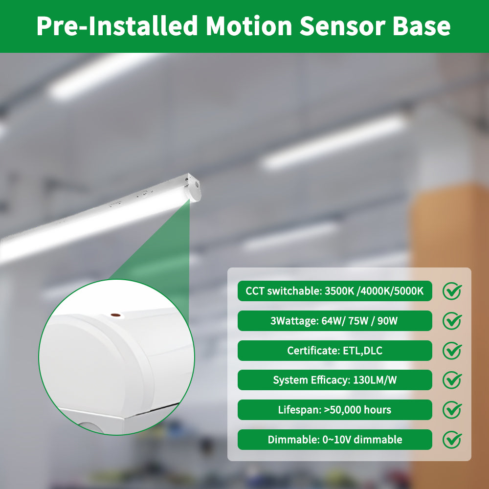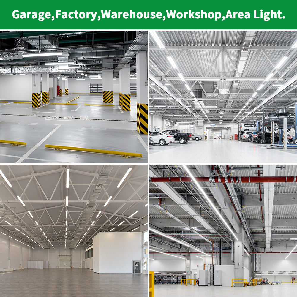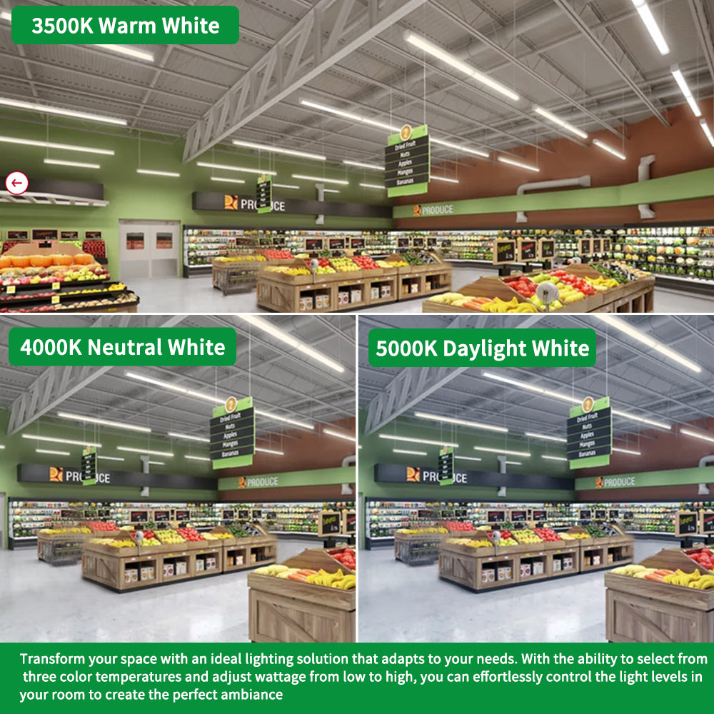 The Haloitte Lighting 8ft LED Strip Light Fixture offers selectable wattage (90W, 75W, 64W) and color temperatures (5000K, 4000K, 3500K), making it adaptable for a wide range of residential and commercial applications. Its curved, frosted, shatterproof lens delivers a 120-degree beam angle, providing diffused, uniform, and glare-free light. Designed for easy installation, the fixture features safety cables that securely hold the lightbox to the base while accessing the wiring compartment, streamlining the installation process.